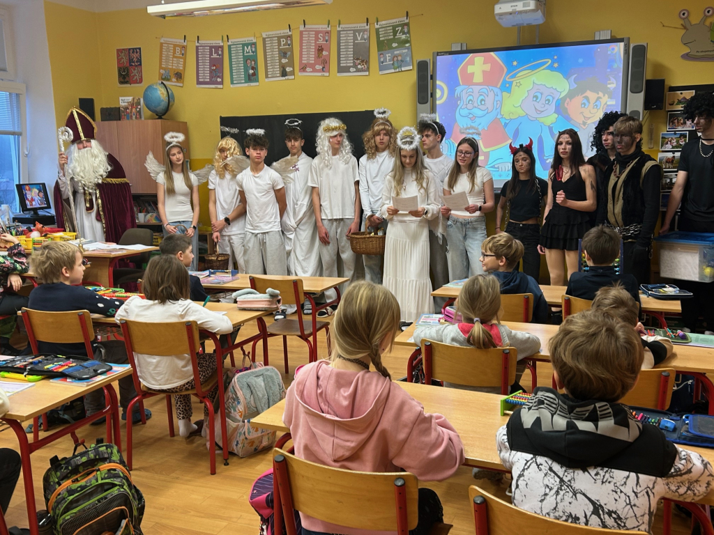Hned následující den školou prošla tradiční mikulášská družina – banda čertů, na kterou dohlíželi andělé a Mikuláš. V jednotlivých třídách společně zhodnotili, jak se dětem daří, a rozdali sladké odměny i trochu čertovského mouru. Děkujeme všem deváťákům, kteří se nám postarali o zábavu.