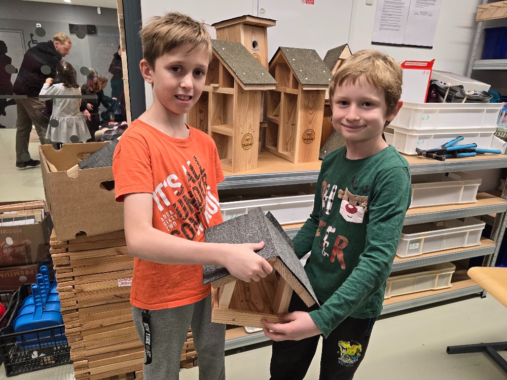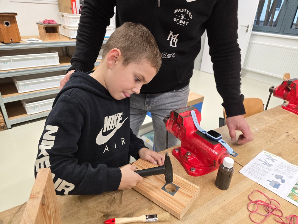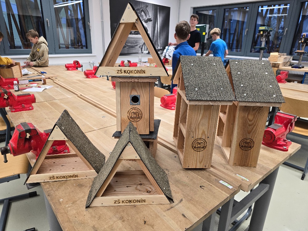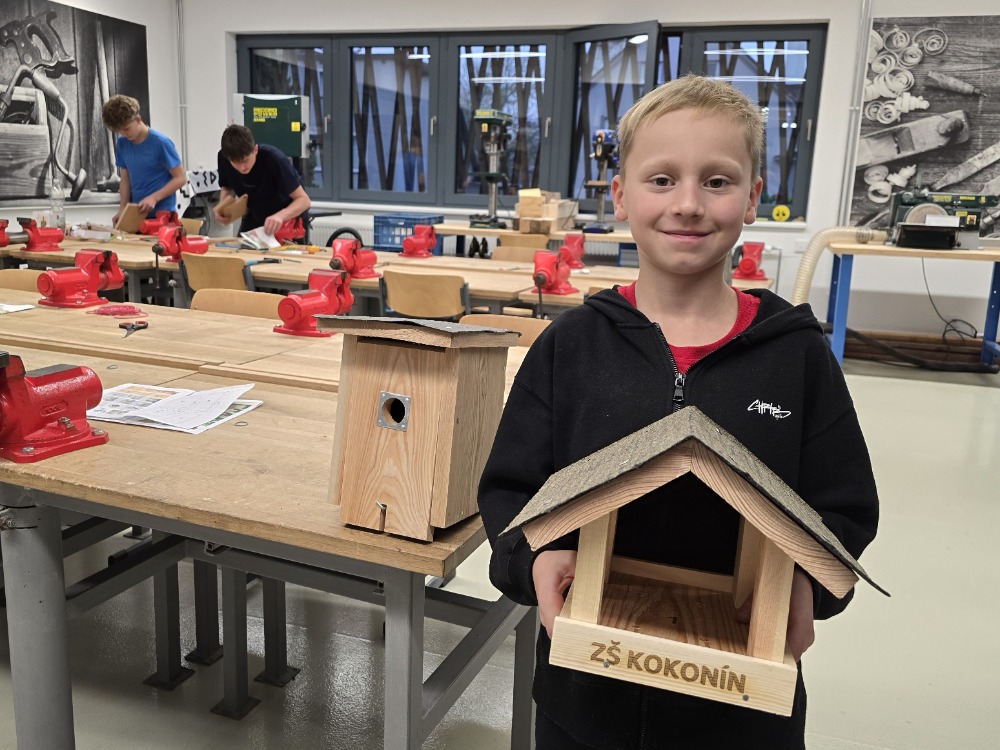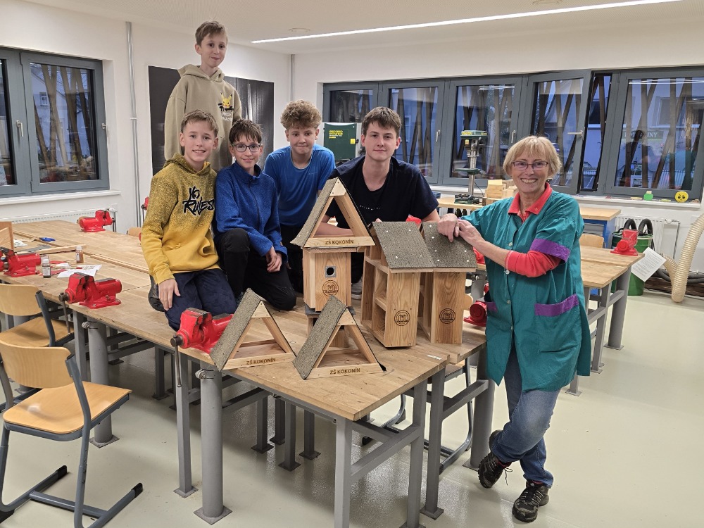 Ve školní dílně se 22. října 2025 opět setkaly tři generace a společně sestavovaly budky, krmítka a hmyzí hotely, které najdou uplatnění u zájemců doma na zahradě. Bylo hezké pozorovat, jak se navzájem děti a dospělí doplňují při společné práci. Nejzkušenější účastníci akce byli žáci z druhého stupně. Ti pomohli všem, kdo to potřeboval a jako zkušení dílenští odborníci také vyrobili sestavy budek, krmítek a hmyzích hotelů pro všechny tři školní zahrady.