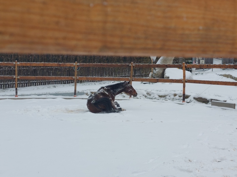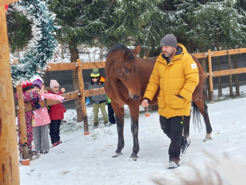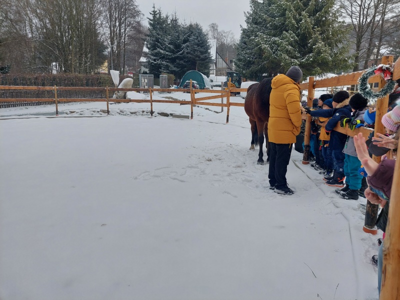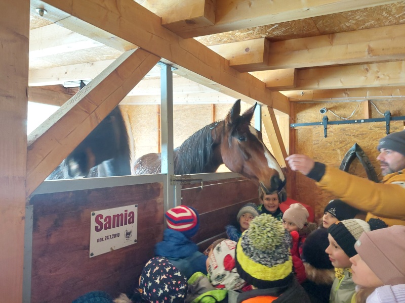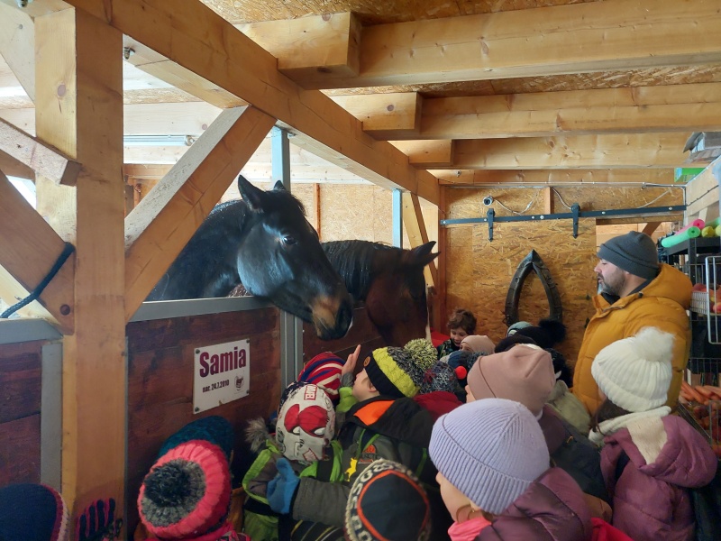 Součástí programu byla i návštěva výběhu, kde měly děti možnost pozorovat koně při jejich zimních radovánkách – viděly také, jak se kůň s chutí „koupe“ ve sněhu, jaké má zuby, a dozvěděly se, jak se ke koním máme chovat. Návštěva byla pro všechny nejen poučná, ale byla nezapomenutelným zážitkem.