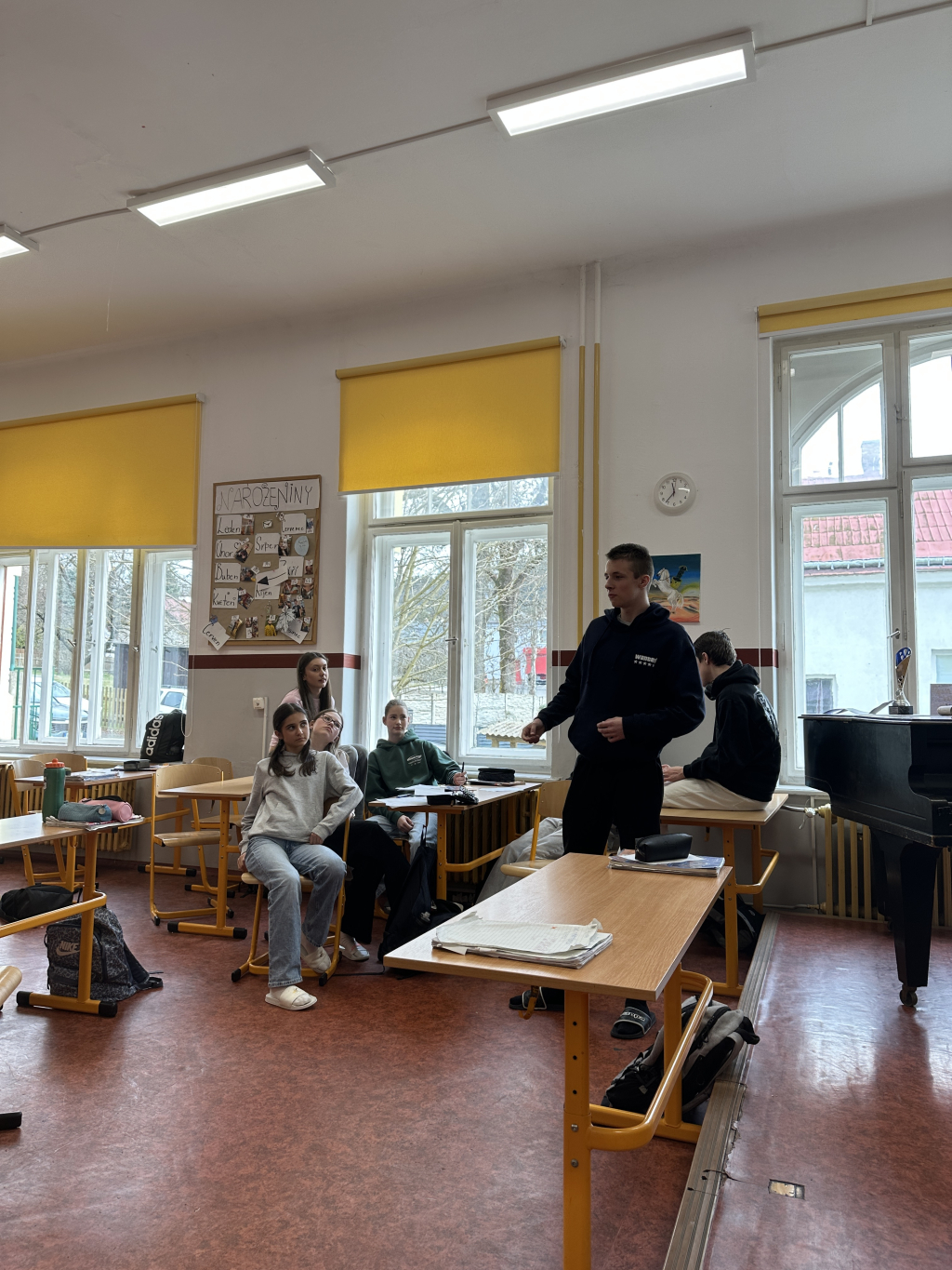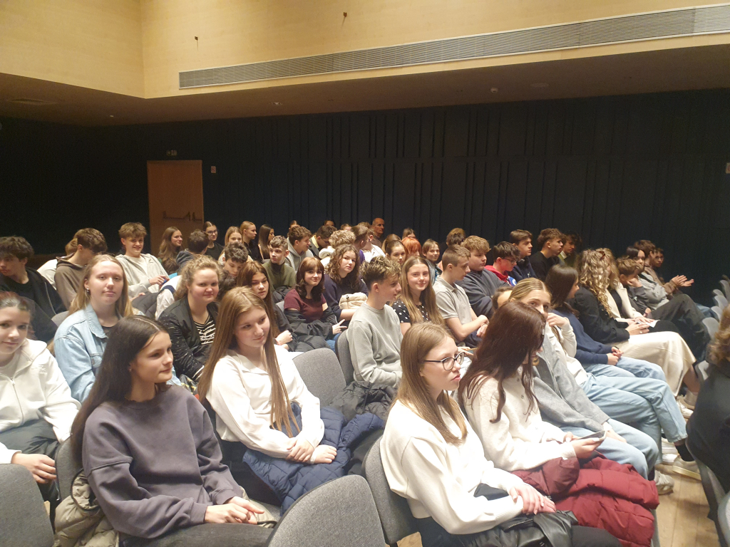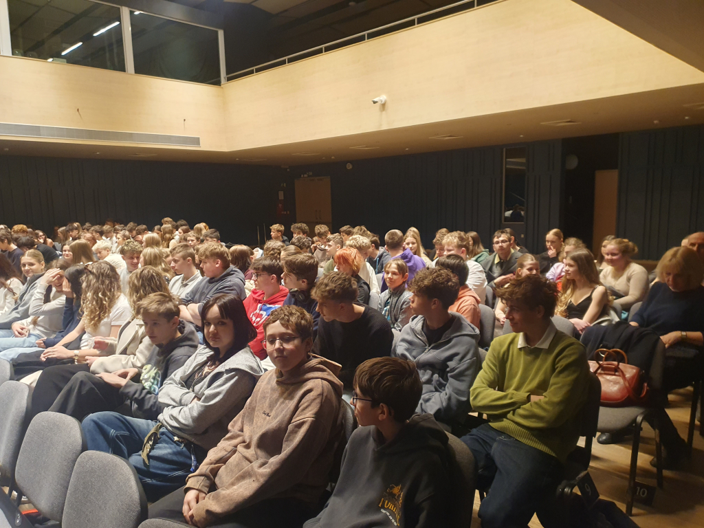 Dne 18. března 2026 žáci osmých a devátých tříd zhlédli divadelní představení Hey People! v Eurocentru v Jablonci n.N. Divadelní centrum Zlín s.r.o. zde uvedlo představení na motivy románu Karla Čapka Válka s mloky, které bylo v českém, ale i v anglickém jazyce. Předcházely mu úkoly do třídy, které nám poskytli sami tvůrci. V nich si žáci předem ujasnili některé anglické obraty, popř. se naučili novou slovní zásobu.