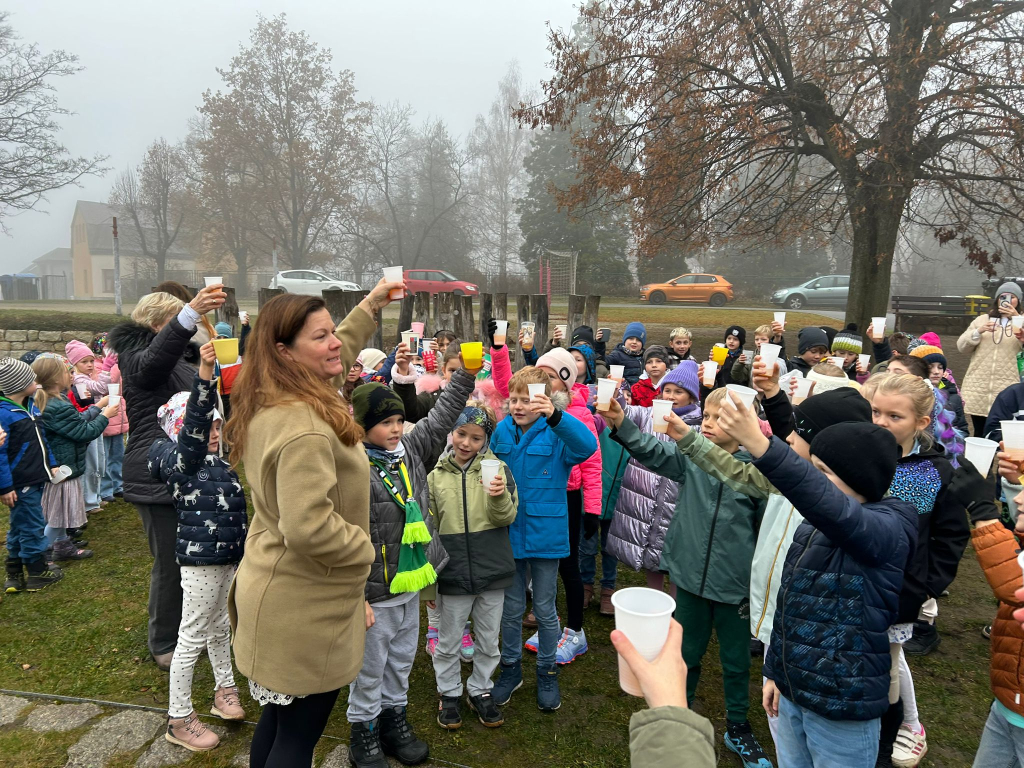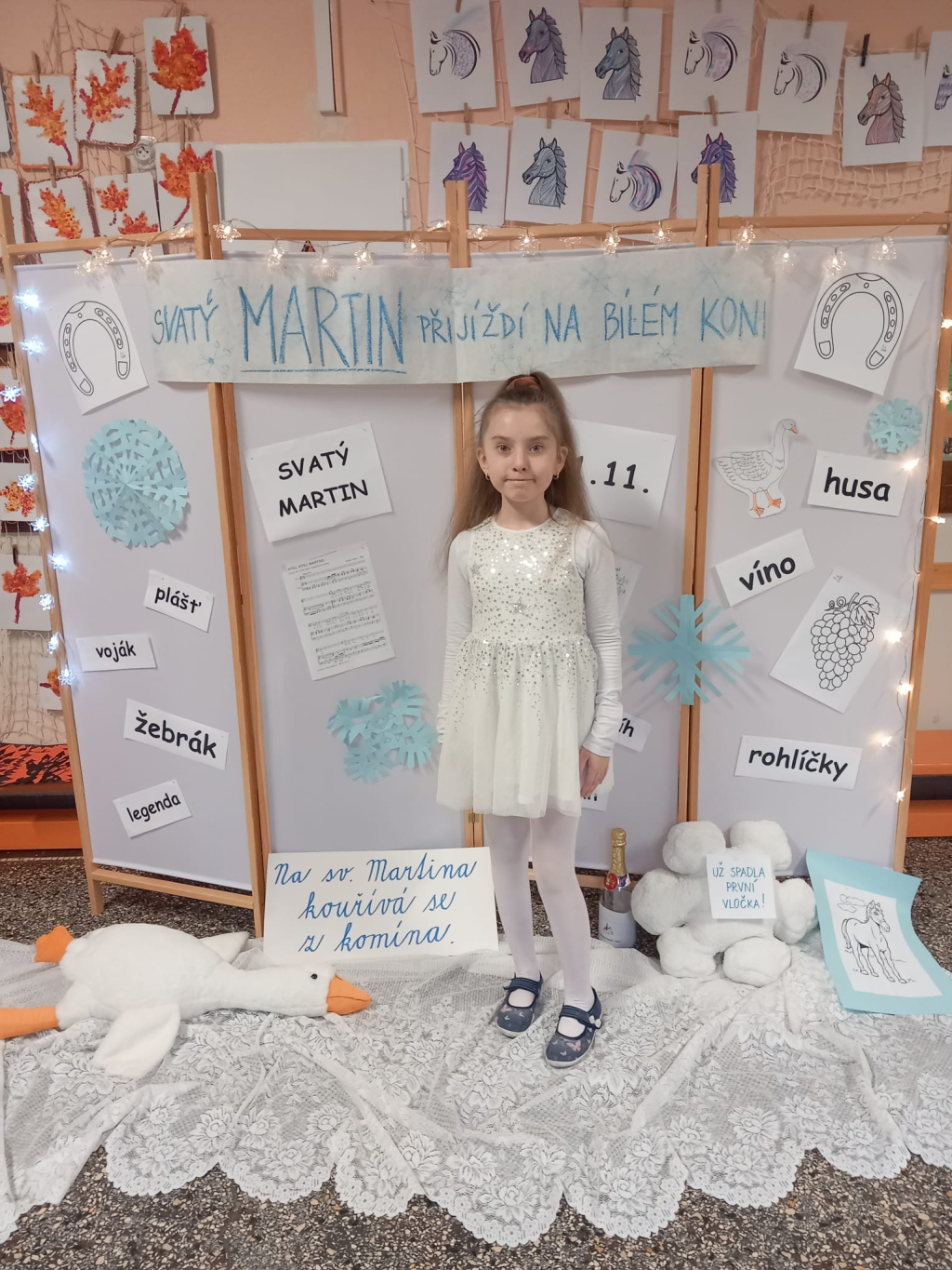 11. 11. v 11 hodin jsme si na Vrkoslavicích oslavy sv. Martina také užili. Děti měly připravenou stezku po podkovách do venkovní učebny, kde pro ně bylo připraveno malé občerstvení. Připili jsme si na Martina a na zdraví všech a zazpívali mu písničku. Všichni v ten den přišli v bílém.